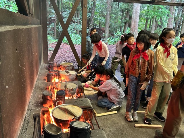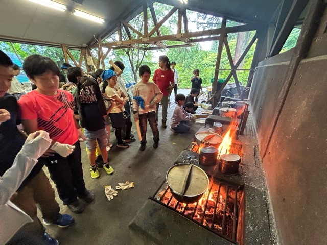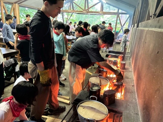 飯盒とカレーの鍋がのっているかまどの火を子どもたちは、眺めています。出来上がりが楽しみで仕方ない様子です。
