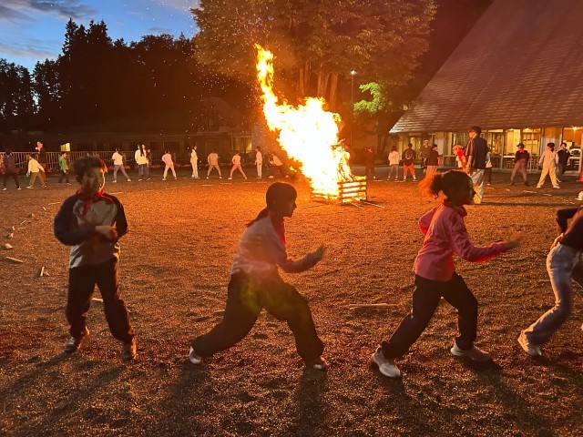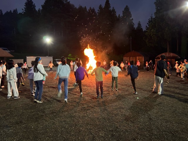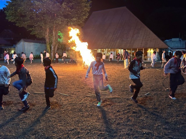 キャンプファイヤーが始まりました。火の神の点火のあと、みんなでジンギスカンを踊りました。すごい盛りあがりです。