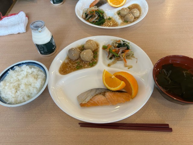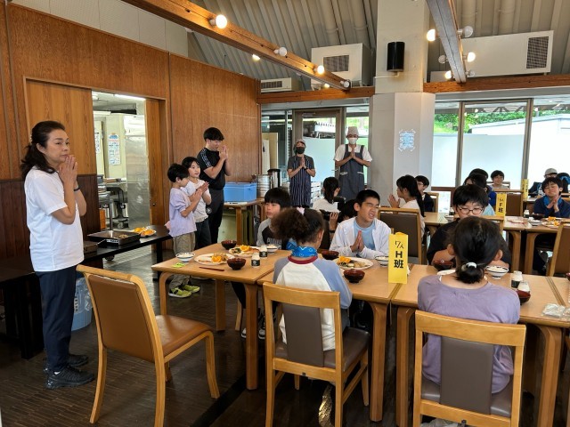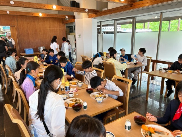 子どもたちが食堂に集まりました。食事係さんのあいさつで食べ始めました。飲むヨーグルトが人気でした。