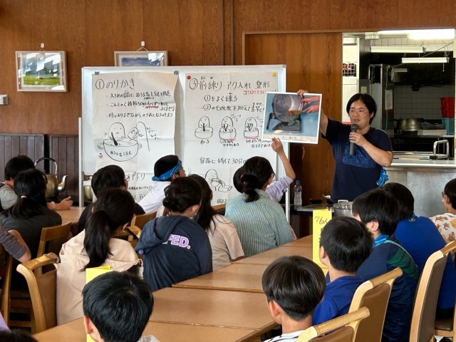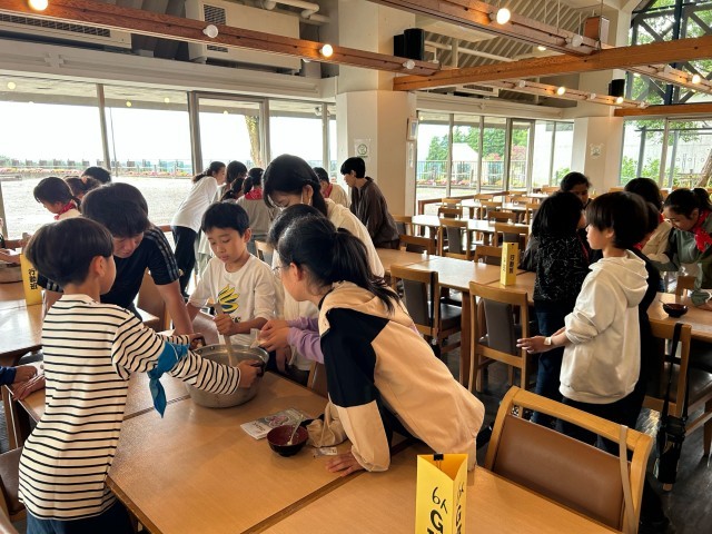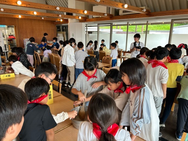 作り方の説明のあと、各生活班ごとにこんにゃくづくりを始めました。ぬるま湯にこんにゃく精粉を少しずつ入れ混ぜていきます。鍋にみんなでのぞいている子どもたちの表情がとても可愛らしいです。