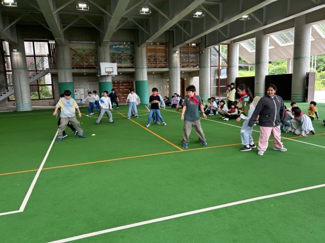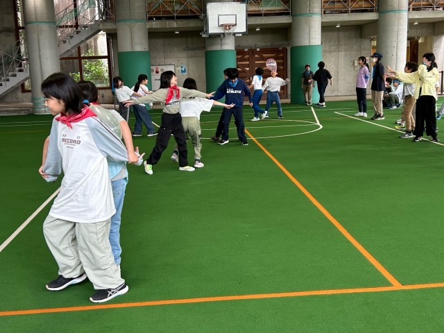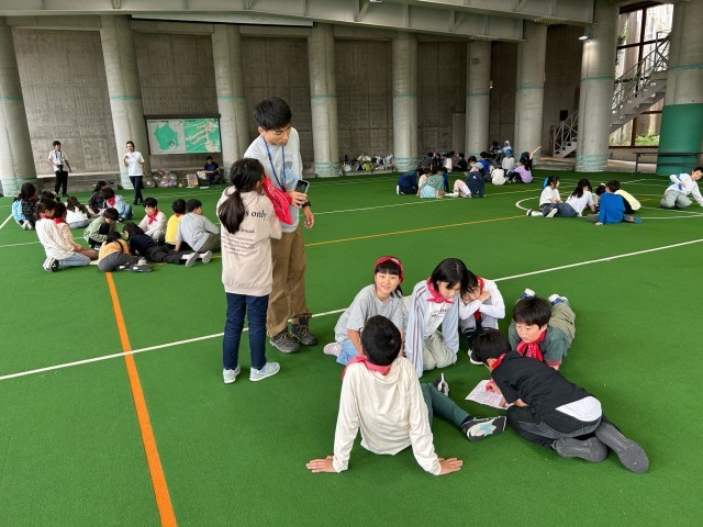 屋根付き広場でレクレーションをやりました。2人組で風船を運ぶゲームや班別対抗でクイズ大会などを行いました。みんなで楽しく盛り上がることができました。