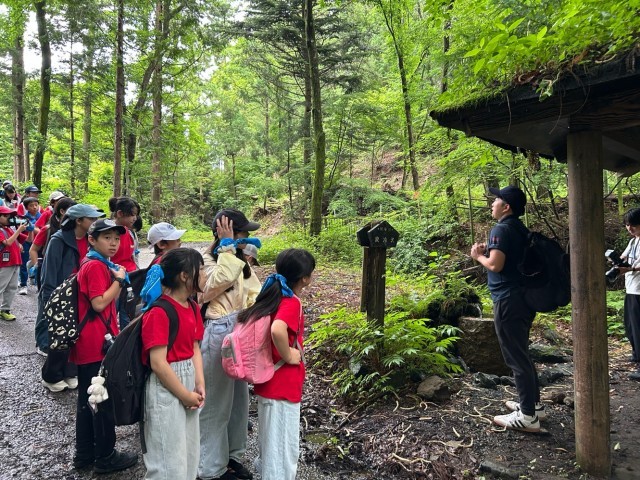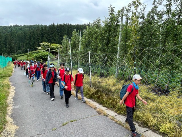 村めぐりに出発しました。りんごの木が並ぶ道をみんなで歩きます。ところどころで先生が、村の特徴について説明をしています。