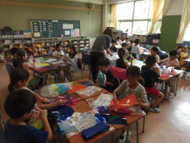 子どもたちはビニル袋の中にカラーセロファンを選んでいろいろな形にしながら入れていきます。とても楽しそうです。さあ、どんな作品が出来上がるのでしょうか。