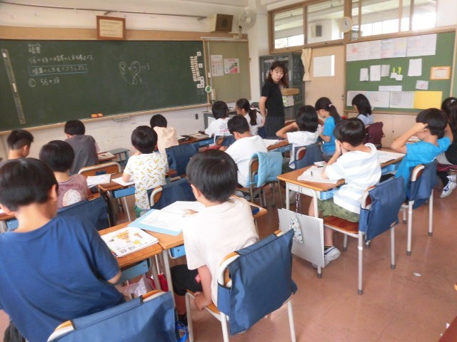 3年生の授業は算数です。暗算の学習をしています。どのように計算をしたら、頭の中だけで計算がしやすいかを考えています。友達の考えを聞き、自分の考えと比べています。3年生になり、計算も少しずつ難しくなってきています。