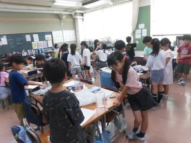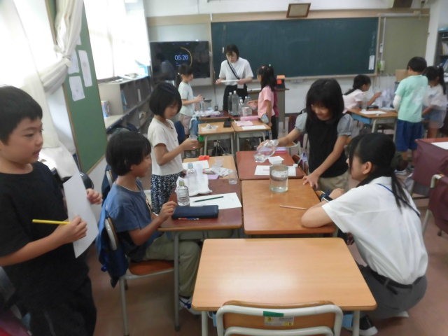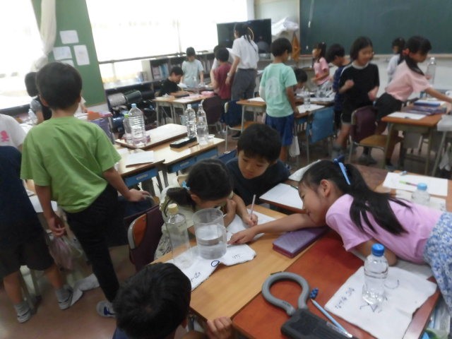 いろいろな水の入れ物には、どれくらいの量の水が入るかを実際に試しています。「予想とぴったり同じだったよ。」嬉しそうに教えてくれる人がいました。子どもたちは、水をこぼさないように気を付けながら、取り組んでいました。