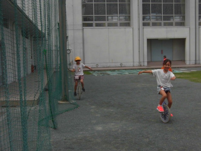 1年生2年生と一輪車で遊びました。今日は6人で手をつないで校庭の端まで行くことができました。次は10人での手つなぎを目指します。