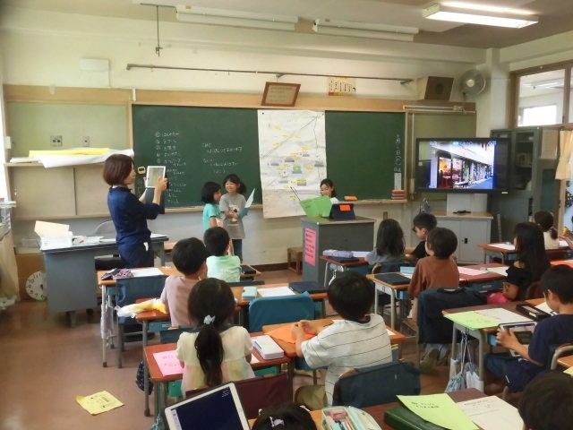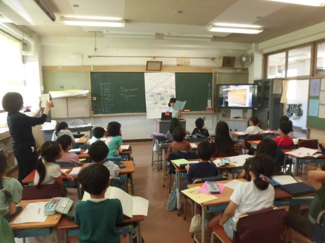 2年生の教室では、まちたんけんの発表会をしていました。まちたんけんで調べてきたお店について、写真を見せながら説明をしています。