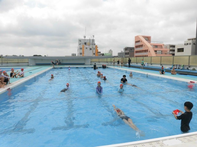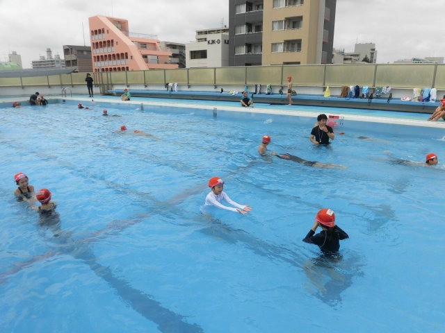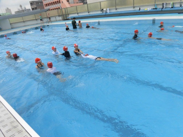 4年生の授業は体育の水泳です。お助けけのびをしています。ペアの友達に全身の力が抜けて足が浮いてきているかを見てもらっています。前回見たときより、足の浮いている人がたくさんいました。すごい上達です。