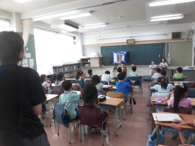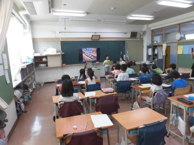 2年生の教室では、まちたんけんの発表会をしていました。子どもたちが回ったお店について、一人ひとり発表をしています。発表する人は、少し緊張をしているようです。しっかりと準備してきたからこそ、緊張しているのですね。
