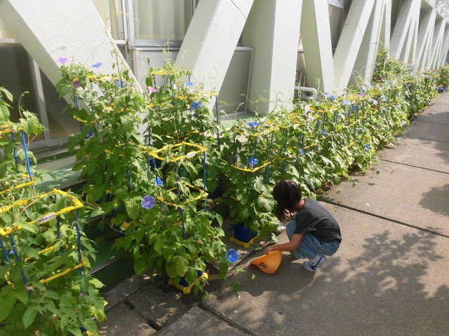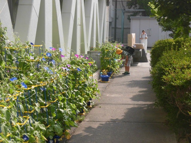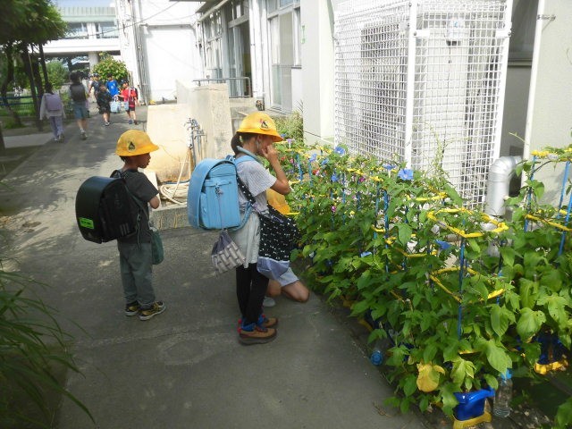 1年生が育てているアサガオに水をあげています。この日差しで、アサガオたちも水を欲しがっているようです。育てているアサガオを見る1年生の姿、かわいらしく感じるとともに、あたたかい気持ちになります。
