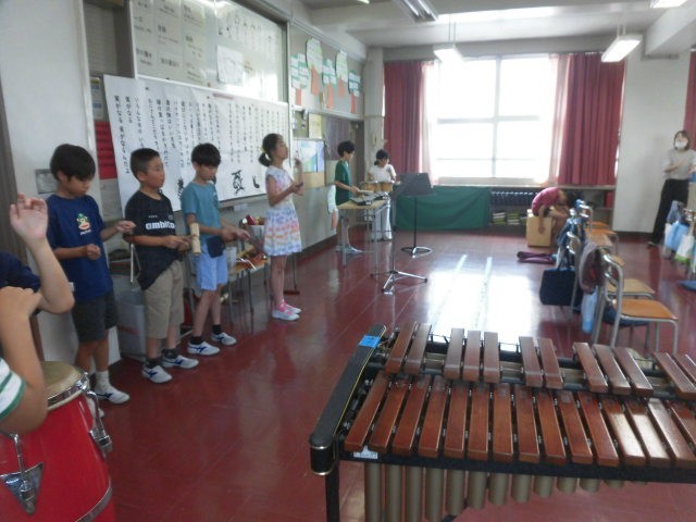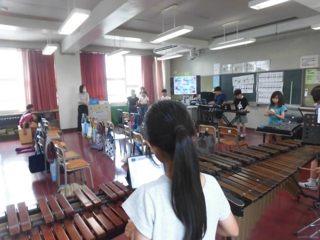 全体で演奏をしていました。それぞれ担当する楽器が異なります。同じ担当の人と息を合わせ演奏に取り組みます。身体でリズムをとりながら演奏する姿がとてもすてきでした。