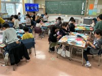 1年生は図工です。封筒を使って口が動く人形を作っています。折り紙を使って色とりど...