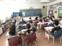 5年生は英語の授業です。「on」「in」「under」「by」という場所を表す言...