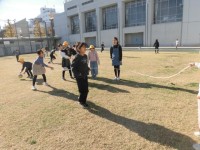 長縄で遊んでいる人たちがたくさんいます。3年生の長縄に6年生も混じって遊んでいま...
