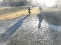 はやく登校した人たちが校庭にいます。早朝にまいたスプリンクラーの水が地面で凍って...