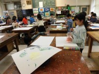 2年生の授業は図工です。洗剤に絵の具を混ぜ泡をつくって、画用紙の上に落としていま...