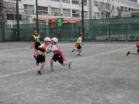 3年生の授業は体育です。フラッグフットボールの授業です。一つのプレイごとに子ども...