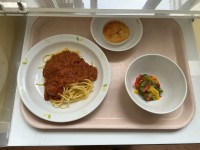 牛乳・きのこミートソーススパゲッティ・カラフルサラダ・りんごマフィン 今日は、秋...
