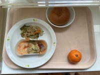 牛乳・黒砂糖パン・魚のピザ風・野菜ソテー・果物(みかん) 今日は、魚をピザ風に仕...