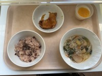 牛乳・赤飯・鶏肉の甘辛揚げ・あんかけ汁・ミルクゼリーのピーチソースがけ 今日は、...