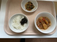牛乳・ご飯・韓国風ふりかけ・韓国風肉じゃが・野菜の醤油炒め 本日、諸事情により野...