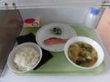 <献立> セルフおにぎり 牛乳 鮭の塩焼き 大根と青菜の漬け物 みそ汁 <主な食...