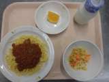 〈献立〉 ○スパゲッティミートソース ○牛乳 ○じゃがいものハニーサラダ ○くだ...