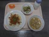 〈献立〉 ○そぼろごはん ○牛乳 ○三平汁 ○キャベツのゆかりかけ ○くだもの ...