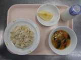 〈献立〉 ○わかめごはん ○牛乳 ○豚肉の南蛮あげ ○即席漬 ○けんちん汁 〈...