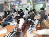 3年生の授業は国語です。一つの漢字の音読みと訓読みを使って文章作りをしています。...