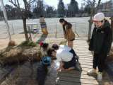 ビオトープに3年生が集まっています。一人がバケツを持っています。ビオトープの水を...