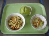 <献立> カレーうどん 牛乳 白菜のおかかかけ 明日葉入り蒸しパン 今月の食育...
