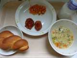 <献立> ○丸パン ○魚のフライ ○野菜のレモンかけ ○クリームスープ <主な...