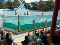 イルカショウの時間です。客席は満席で立ち見が出るほどです。イルカが水面から飛び出...