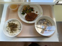 牛乳・麦ご飯・ふりかけ・和風コロッケ・野菜のからし和え・にらたまスープ・りんごゼ...