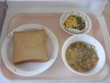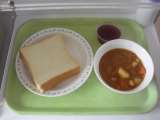 <献立> ジャムサンド 牛乳 ビーンズシチュー ぶどうゼリー