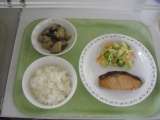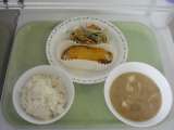 <献立> ごはん 牛乳 魚のもみじ焼き 水菜のおひたし 大根汁