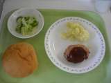 <献立> 丸パン 牛乳 アップルチーズハンバーグ じゃがバター グリーンサラダ