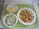 <献立> じゃこと青のりのごはん 牛乳 家常豆腐 りんご <主な食材の産地> に...