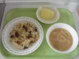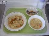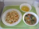 <献立> ナシゴレン 牛乳 ベーコンと白菜のスープ みかんゼリーポンチ