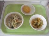 <献立> ちゃんこうどん 牛乳 菊花蒸し団子 みかん