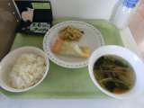 <献立> ごはん 牛乳 棒餃子 春雨サラダ 中華スープ