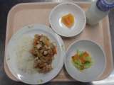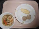 <献立> ○ちゃんこうどん ○牛乳 ○肉団子のもち米蒸し ○くだもの(りんご) ...