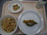 <献立> ○きつねうどん ○牛乳 ○ししゃもの二色揚げ ○野菜のごまみそかけ ...