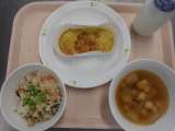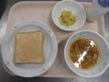 <献立> ○タラモトースト ○牛乳 ○野菜のドレッシングかけ ○白いんげんの田舎...