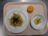 <献立> ○和風スパゲッティ ○牛乳 ○パリパリサラダ ○くだもの(みかん) ...