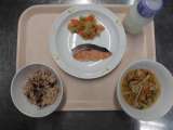 〈献立〉 ○赤飯 ○牛乳 ○魚の塩焼き ○きんぴら煮 ○沢煮椀 〈主な食材の産...