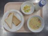 〈献立〉 ○二色サンド ○牛乳 ○キャベツサラダ ○クラムチャウダー 〈主な食...