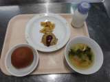 〈献立〉 ○ココアパン ○牛乳 ○アップルチーズハンバーグ ○スパイシーポテト ...