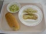 <献立> レーズンパン 牛乳 魚のチーズ焼き バジルのペンネ キャベツサラダ <...